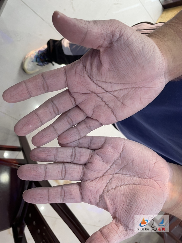 30多攝氏度的氣溫,悶熱的防護服,馬不停蹄的采樣檢測,王禹鵬早已大汗淋漓。晚上快7點完成檢測點的工作后,脫下防護服和手套,王禹鵬發現自己的手已經變得皺巴巴的了,衣服也被汗浸透了。這一幕被身邊的社區工作人員捕捉到,之后就在網上傳開了。